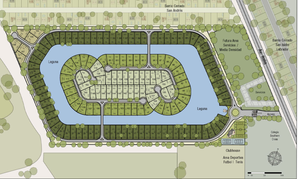 Barrio de 20 hectáreas se sitúa sobre una antigua cancha de golf, rodeado de un lago y una arboleda de más de 20 años. Ofrece un club house con restaurante, dos canchas de tenis y una cancha de fútbol. Con 15 hectáreas de áreas forestadas y 5 hectáreas de laguna, cuenta con un total de 158 lotes, de los cuales 118 están al agua y 40 son internos, con un promedio de 700 m² cada uno.